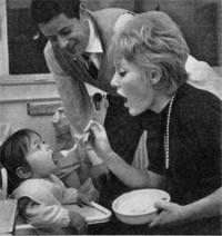 We are interrupted by small sharp screaming sounds coming from the adjacent room. It is Barbara who is waking up. One has to see Petula taking her daughter in her arms, talking to her tenderly in French, rocking her. I have trouble imagining that this young mother (Petula turned 30 years old just last week) who is showing her motherly love to her child, is the same person who sings and dances every night on the stage of the Olympia. Claude Wolff during that time went to get a big stuffed rabbit and plays around with it to the greatest joy of Barbara. Yes, in fact, the Wolff family is a happy family.