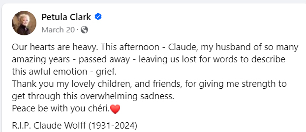 On March 20th, 2024, on her official Facebook page Petula sadly announced,