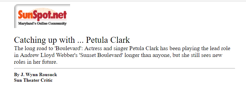 Because of Clark's film background, Susan H. Schulman, director of the touring production of "Sunset Boulevard," felt Clark would have a natural connection to Norma. And Clark acknowledges, "I can understand [Norma's] love of the movies, her love of being back in the studio, for instance. It's not difficult for me to feel that amazing feeling, as she walks in, of: This is where I belong. There's a sweetness to her which comes out in that particular sequence."