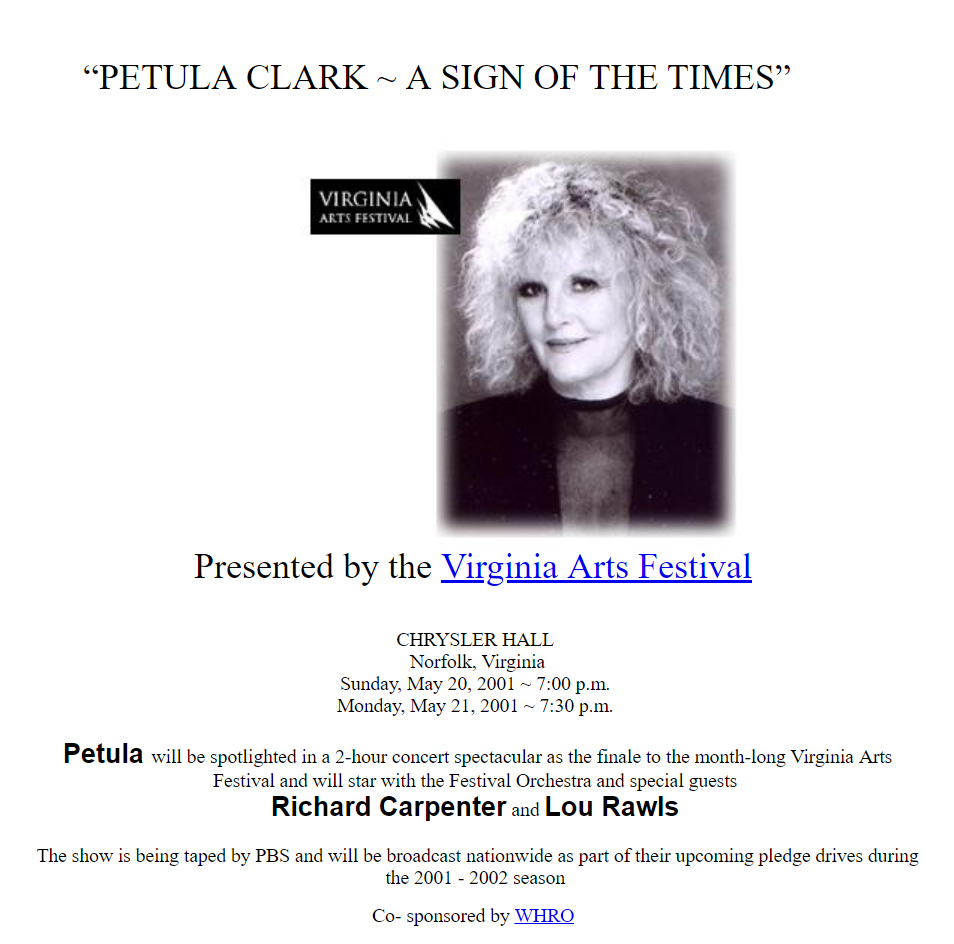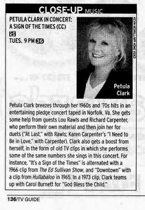 Hosted by Connie Stevens. Petula appeared with Bruce Morrow ("Cousin Brucie") during the WNET, New York, pledge break.