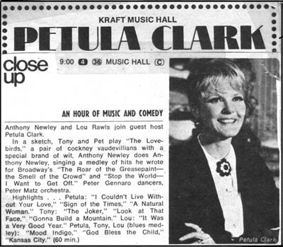 Petula hosts. Guests: Anthony Newley, Lou Rawls.