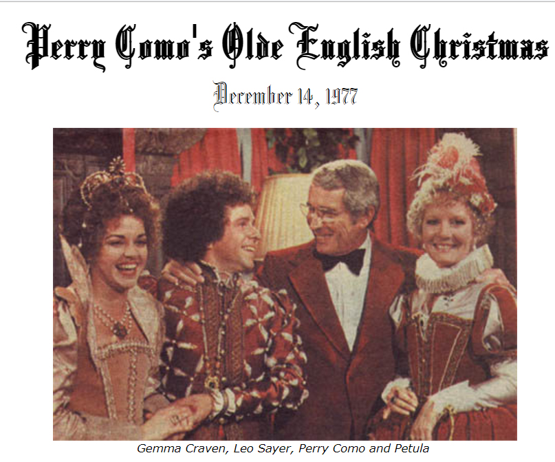 Medley with Cast: Good King Wenceslas/God Rest Ye Merry Gentlemen/The Holly & the Ivy/I Saw Three Ships/Joy to the World/We Wish You a Merry Christmas ~ Where Is Love ~ There's a Kind of Hush (with Como) ~ You're My Destiny ~ The Pantomine Tradition ~ Hot Diggity with cast