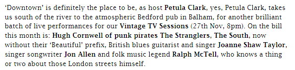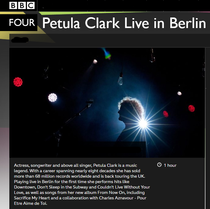 A compilation from the BBC archives of 24 performances of songs about London. Petula sings A Foggy Day. A caption on the screen says it is from The Wayne and Shuster Show dated 1973. The Wayne and Shuster Show with Petula as guest was broadcast on 25th September 1965