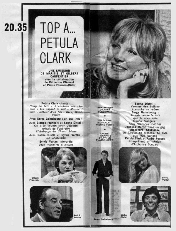With Jean-Claude Brialy Guests: Sacha Distel, Françoise Hardy, Sylvie Vartan, Jean-Claude Brialy, Colette Brosset, Serge Gainsbourg, Jacques Dutronc, Robert Dhéry & Frank Owens Petula et son ombre (duet with her reflection in a mirror), Des images me reviennent, Tiens te voilà, Petula (with singers), La fille au pair (duet with Sylvie Vartan), Le train du retour, This Guy's In Love With You (clip from This Is Tom Jones), The Long And Winding Road (with Frank Owens at the piano), La gadoue/Les incorruptibles/Ô shériff (with Serge Gainsbourg), Oum papa (with dancers, from Oliver), Tu viens quand tu peux, tu pars quand tu veux, Une fille à la mer (with Jacques Dutronc), dances over Un doigt de champagne with Omar Sharif, Bye bye mon amour/Bye Bye Love (with Serge Gainsbourg, Jacques Dutronc and Frank Owens at the piano)